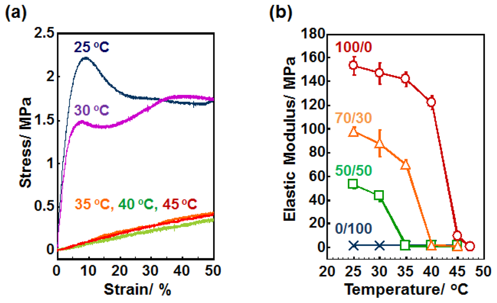 (a) Stress-strain curves of crosslinked PCL films with 50/50 of 2b/4b ratio at 25, 30, 35, 40 and 45 °C; (b) Elastic modulus of crosslinked PCL films with various 2b/4b ratios as a function of temperature.