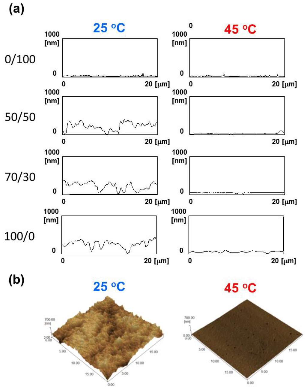 In addition to bulk properties, surface properties such as morphology and wettability are important for cell adhesion and spreading process [,]. The morphologies of the PCL surfaces were imaged by AFM at 25 and 45 °C. Although temperature can limit the sensitivity and resolution of the AFM measurement, this is beyond the scope of this article and is not reported here. Figure 3 shows topographic surface images of PCL films at 25 °C and 45 °C observed by AFM over an area of 20 × 20 μm2. In amorphous PCL (0/100), the large difference was not observed between 25 and 45 °C. The surface mean roughness values (Ra) were 6.2 and 6.1 nm, respectively. For the 50/50, 70/30, and 100/0 PCL films which have the Tm between 25 and 45 °C, on the other hand, irregular rough structures were observed at 25 °C due to the crystallization of PCL (left images in Figure 3a). The Ra values for 50/50, 70/30 and 100/0 PCL films were found to be 63.4, 83.6, and 85.5 nm, respectively. It is well-known that morphology or patterns of crystalline structures of PCL can be influenced by the growth kinetics, temperature, composition, etc. []. In this study, films with higher Tm showed larger crystals at 25 °C. When the films were heated at 45 °C and imaged again, the surfaces became relatively smooth with the Ra values of 12.4, 13.4, and 27.6 nm for 50/50, 70/30, and 100/0, respectively (right images in Figure 3a). Figure 3b shows the representative 3D AFM images of 70/30 PCL films at 25 (left) and 45 °C (right). Clear difference can be also seen in the phase contrast AFM images between two surfaces as shown in the supporting information (Figure S3). In general, the AFM signal is influenced not only by the topography but also by e.g., local elasticity variations or changes in the interaction potential if the surface is made up of different materials []. The phase shift can be thought of as a delay in the oscillation of the cantilever as is moves up and down in and out of contact with the sample. Therefore, phase contrast is one of the most commonly used techniques for mechanical or viscoelastic characterization of sample surfaces. The phase images of 70/30 PCL films measured at 25 and 45 °C are found to be darker and brighter corresponding to less and more stiff, respectively. These results indicate that not only bulk stiffness but also surface stiffness of PCL film have been dramatically changed by heating.