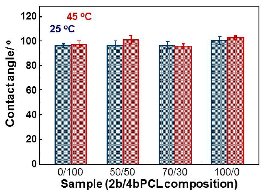 Contact angles on PCL films at 25 and 45 °C. Error bars represent standard deviation for n ≥ 6 measurements of independent experiments.