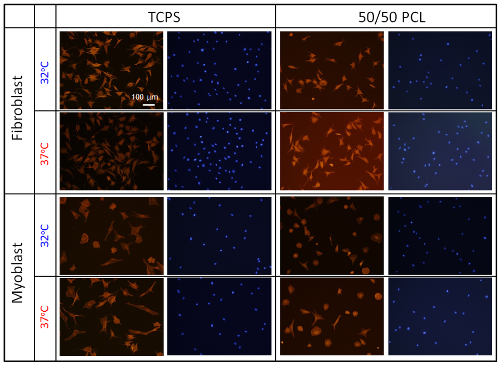 Fluorescence microscopy images of fibroblasts and myoblasts seeded on TCPS (left) and 50/50 PCL (right). Cells were cultured at 32 or 37 °C for 24 h. The cells were fixed with paraformaldehyde and treated with Rhodamine phalloidin for F-actin staining (red) and DAPI for nucleus staining (blue).