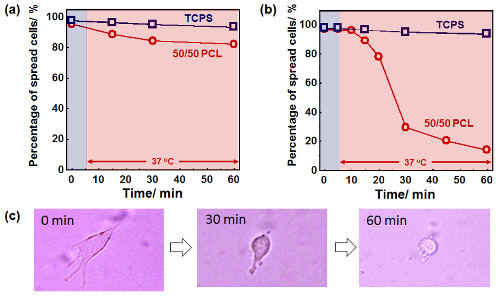 Time-dependent changes in the cell morphologies on PCL films after the crystal-amorphous transition. Cells were cultured on the films at 32 °C for 24 h. The cells were then subjected to a 37 °C heat treatment. The percentage of spread cell numbers on the surface was plotted against time. (a) Fibroblast; (b) Myoblast; (c) Phase contrast images of myoblasts on 50/50 PCL film after heat treatment.