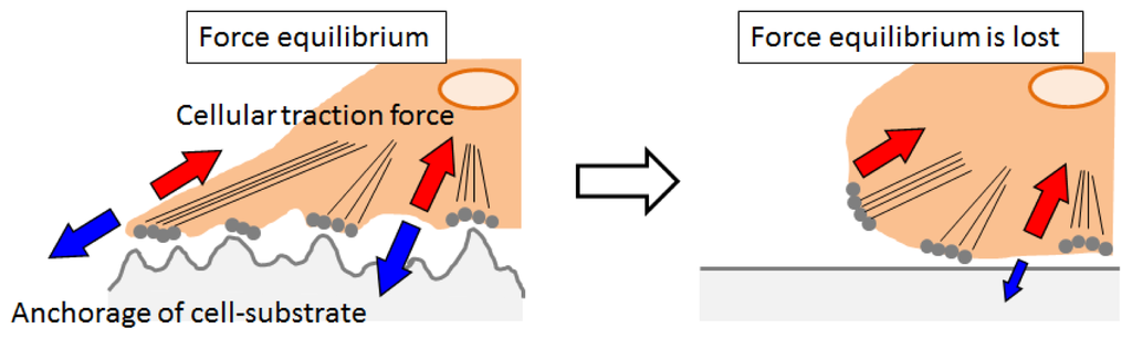 The possible mechanisms of cell detachment in response to dynamic changes in surface crystallinity. There is equilibrium between the pulling forces developed by the cytoskeletal dynamics and tensile stress of the substrate. Sudden transition of the surface from crystal to amorphous abolishes tight anchorage of cell-substrate. As a result, the force equilibrium is lost and the remaining tensile forces developed by the cytoskeleton cause cell rounding.