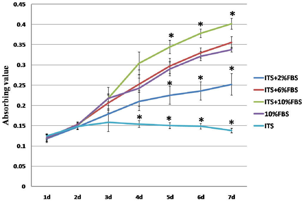Monolayer growth rates of chondrocytes cultured in different media were determined by MTT assay for seven days. Error bars indicate standard deviations of the mean for three repeats; * Indicate the significant differences compared with all other groups at the same time point; d: day.