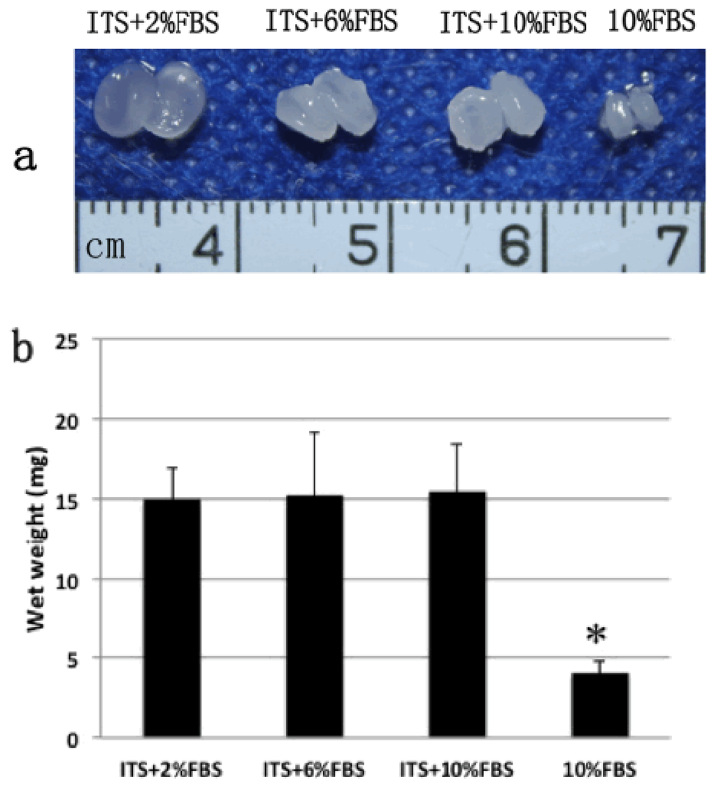 The pellet sizes in the three ITS plus FBS groups were all similar and significantly larger than that in 10% FBS alone group. The wet weights of the three ITS plus FBS groups were significantly higher (p < 0.01) than that of FBS alone group (Figure 2b). No significant difference in wet weight was observed among the three ITS plus FBS groups. These results suggested that ITS can promote the formation of engineered cartilage in the presence of FBS.