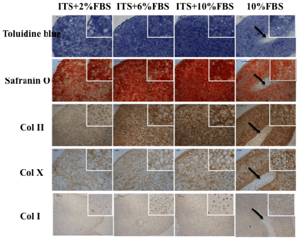 In the current study, the chondrocyte pellets were homogenous in three groups with ITS plus FBS, while the pellets were heterogeneous (black arrows in Figure 3) with some fibrous tissues at the center of the pellet in FBS alone group. This indicated that ITS effectively enhanced the thickness and homogeneity of cartilage formation (Figures 2 and 3). The cartilage pellet in the outer part was much easier and quicker to form than that in the inner part because the nutrition distribution and metabolites was better in the outer part of the pellet [18,19]. In addition, the outer compact cartilage matrices may block the transportation of nutrition and byproduct of the inner part during the cartilage formation processes, which eventually lead to insufficiency of cartilage formation with “hollow” formation at the central region [18,20]. The mechanism of ITS in enhancing the thickness and homogeneity of cartilage formation is not clear but it may be involved in progressive effect of ITS on cell proliferation, migration, and nutrition transportation [20]. The matrices in the outer region of the pellets formed in ITS supplemented groups was not as dense as that in FBS alone group, which enhanced the efficient transportation of nutrition into the inner part and thus contributed to homogenous cartilage formation. The accurate mechanism needs to be further verified.