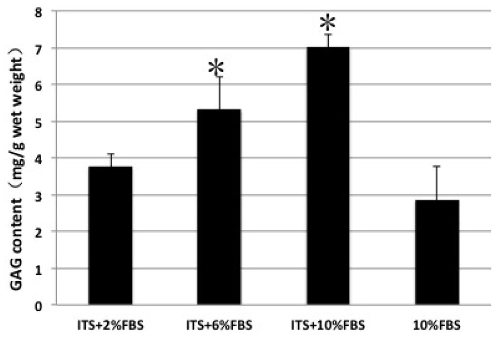 The GAG content analysis confirmed the histological results of toluidine blue and safranin O staining. ITS plus 10% FBS group had the highest GAG content and showed a significant difference compared with other groups. Consistent with weak positive staining of toluidine blue and safranin O, 10% FBS alone group showed significantly lower GAG content (Figure 4). These results suggested that ITS enhanced the formation of cartilage specific extracellular matrix.