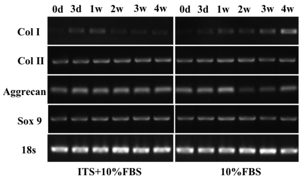Pellets in ITS + 10% FBS group and 10% FBS alone group were collected at different time points (0 day, 3 days, 1 week, 2 weeks, 3 weeks, 4 weeks; 3 pellets/group/time point) and then minced. Total RNA was extracted using TRIzol reagent (Invitrogen, Carlsbad, CA, USA) according to the manufacturer’s instructions. RNA was reverse transcribed into cDNA.