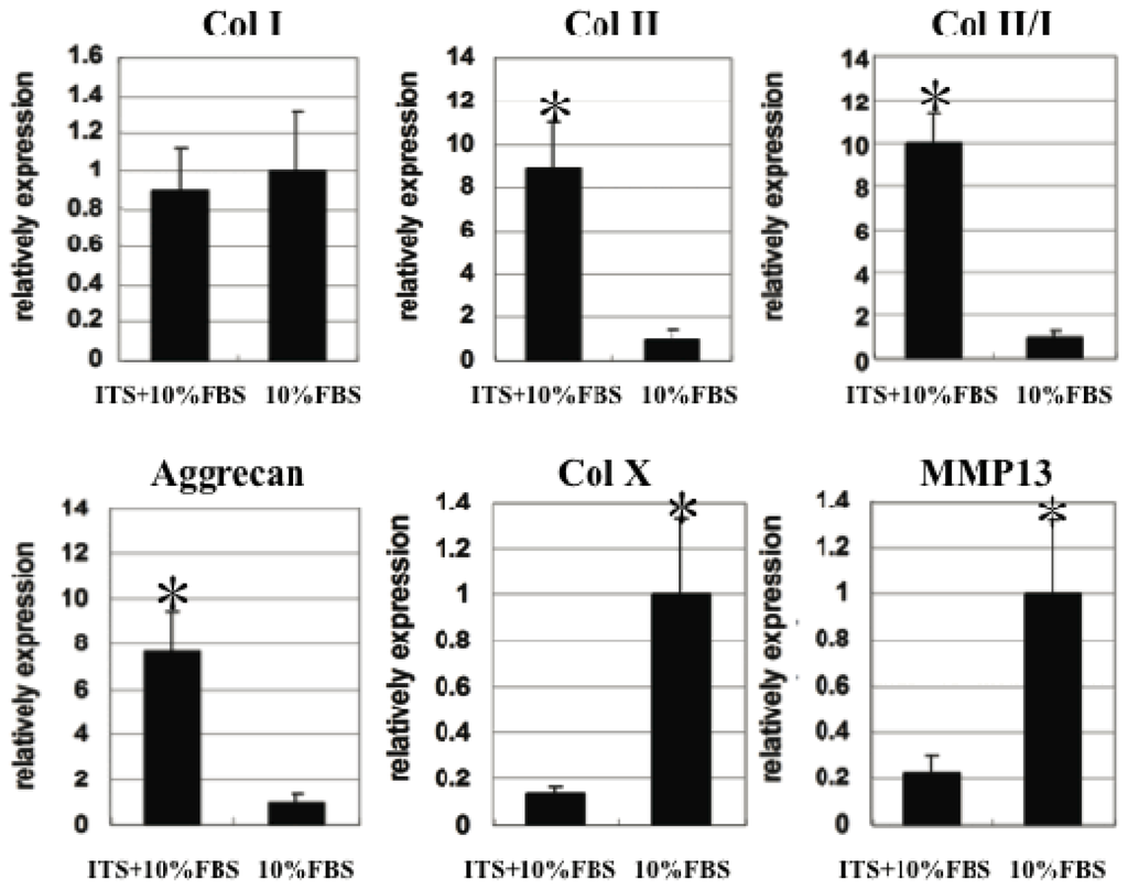 Quantitative real-time PCR results of Col I, Col II, Col X, aggrecan, and MMP13 expression in chondrocyte pellets cultured for four weeks in two groups. * Indicate significant differences.