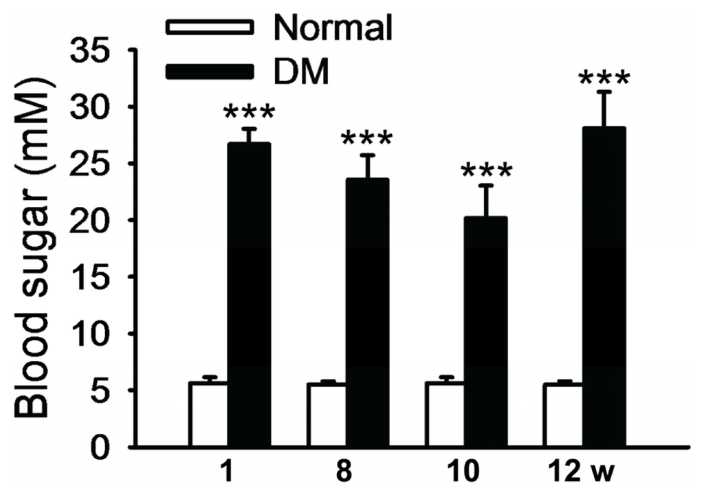 Blood glucose in STZ-induced diabetic rats. Blood glucose in the normal and diabetes mellitus (DM) groups was examined at weeks 1, 8, 10, and 12 following diabetic induction. The data represent mean ± SE, n = 5–14, *** p < 0.001, Normal vs. DM.