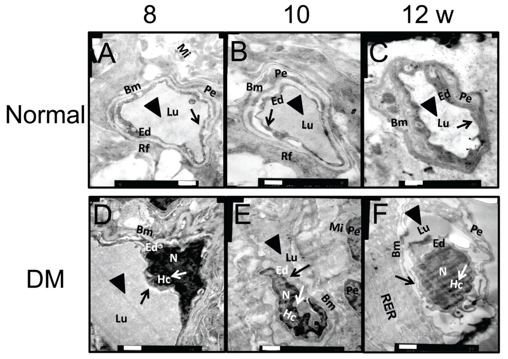 Ultrastructures of retinal microvessels in STZ-induced diabetic rats. The ultrastructures of retinal microvessels in normal (A–C) and DM rats (D–F) were examined by TEM at weeks 8, 10, and 12 following diabetic induction. Representative pictures are shown (n = 5). Black triangles refer to capillary lumen, black arrows refer to endothelial cells, and white arrows indicate heterochromatin. Bm: Basement membrane, Lu: capillary lumen, Ed: endothelial cell; Pe: pericyte; Mi: mitochondria, Rf: reticular fiber, N: nucleus, Hc: heterochromatin, RER: rough endoplasmic reticulum. Scale bar = 500 nm.