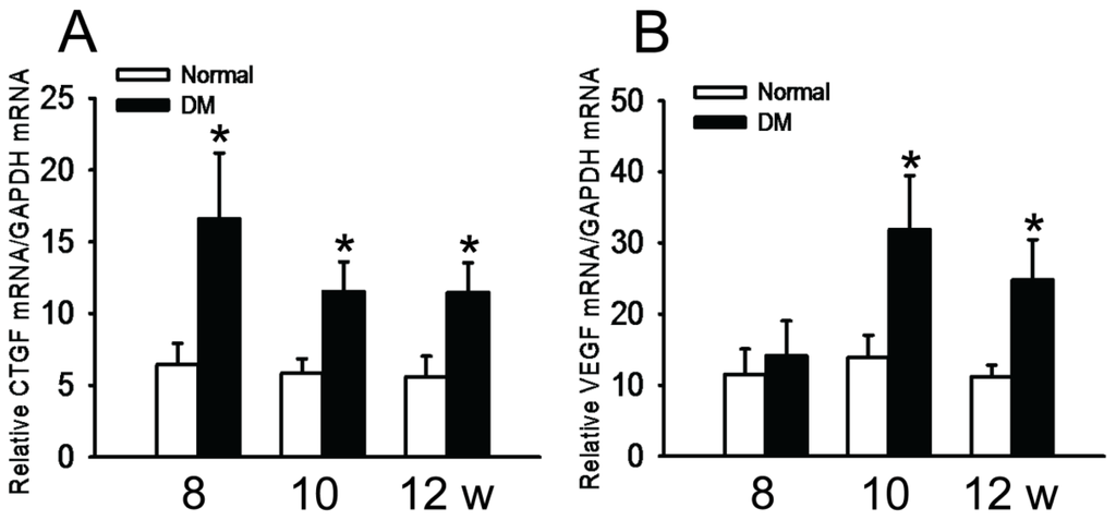 The results of RT-PCR showed that the transcript levels of CTGF were significantly higher in diabetic retinas than in normal ones as early as week 8 following STZ induction (p < 0.05), and this up-regulation was maintained through week 12 of diabetes (p < 0.05) (Figure 3A). On the other hand, the VEGF mRNA level in diabetic retina was similar to normal retina (p = 0.669) at week 8 following diabetic induction, but it was twice as high as in the normal retina at week 10 after diabetes induction (p < 0.05, DM vs. Normal), the trend of VEGF expression in the diabetic retinas was maintained to week 12 following the disease onset (p < 0.05, DM vs. Normal) (Figure 3B).