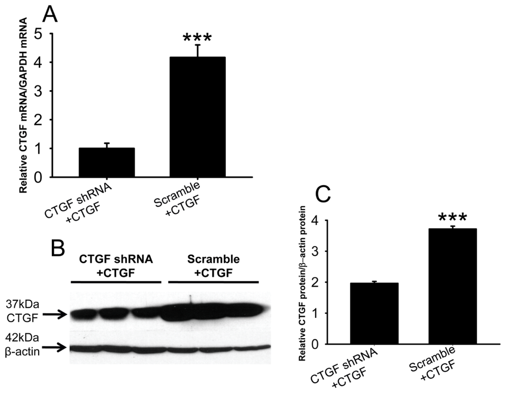 Efficacy of the shRNA against rat CTGF in HEK 293 cells overexpressing rat CTGF. HEK 293 cells were co-transfected with anti-CTGF shRNA or scramble shRNA and rat CTGF cDNA. Forty-eight hours post-transfection, real-time PCR (A) and western blot (B) for CTGF were performed. The mRNA and protein levels of CTGF were normalized to GAPDH and β-actin, respectively; The western blot bands were quantified (C). The data represent mean ± SE, n = 3, *** p < 0.001, CTGF shRNA + CTGF vs. Scramble + CTGF.