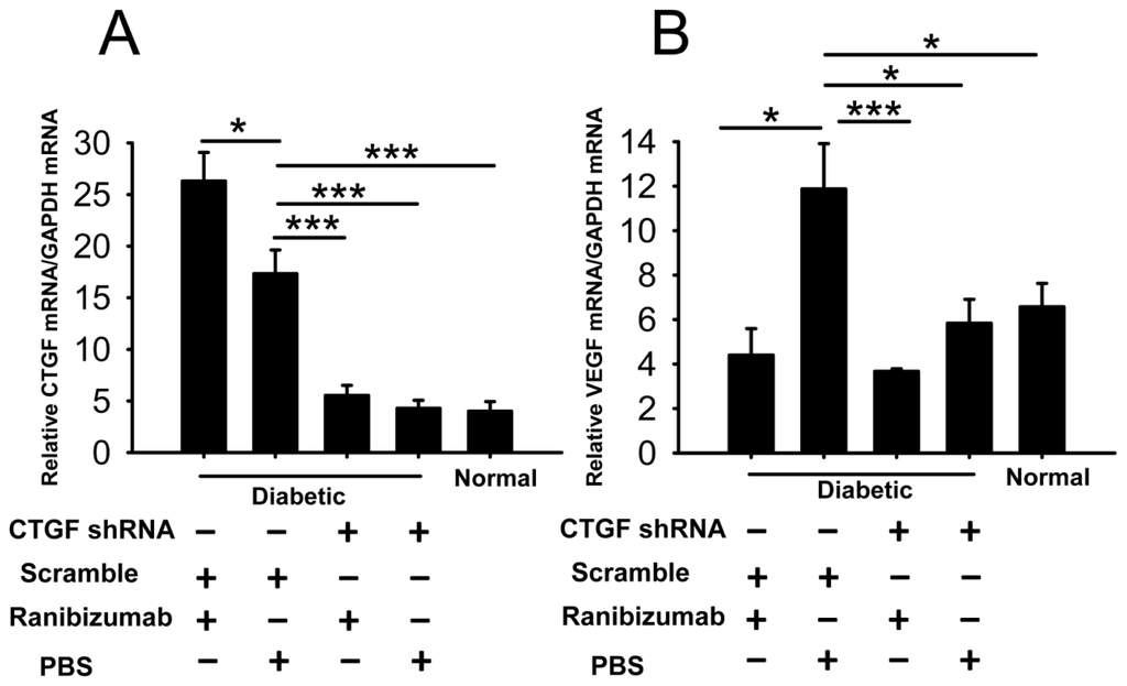 Gene expression changes of CTGF and VEGF in diabetic retina after dual-target intervention using ranibizumab and CTGF shRNA. (A) Relative CTGF mRNA levels in diabetic and normal retinas; (B) Relative VEGF mRNA levels in diabetic and normal retinas. The bottom panel indicates the intervention to which the diabetic rats were subjected, + indicates with the intervention, − indicates without. The data represent mean ± SE, n = 5, * p < 0.05, *** p < 0.001.
