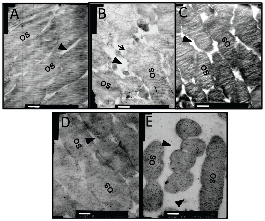 After dissection, the eye cups were immediately fixed with pre-chilled 2.5% glutaraldehyde solution (pH 7.4), then treated with 1% osmium tetroxide solution and dehydrated with graded ethanol. The samples were treated with epoxy propane and embedded in 812 resin (Electron Microscopy Sciences, Hatfield, PA, USA). Ultra-thin sections (±50 nm) were prepared by an ultra-microtome (Leica Ultracut-R, Bensheim, Germany). The sections were stained with uranyl acetate and lead citrate and observed under transmission electron microscope (HITACHI-7500, Tokyo, Japan). The pictures were taken by a MegaView digital electron microscopy system (Olympus Soft Imaging Solutions Corp., Lakewood, CO, USA) with appropriate magnifications.