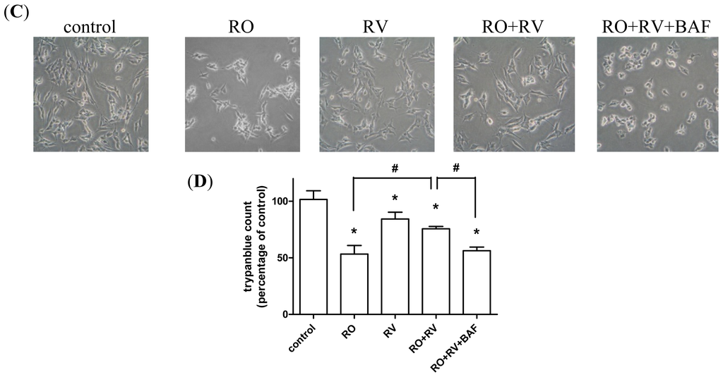 Resveratrol prevents rotenone-induced dopaminergic cell death in an autophagy-dependent manner. (A) SH-SY5Y cells were treated with various concentrations of rotenone (0–100 μM) for 24 h; (B) Cells were pretreated with various doses of resveratrol for 24 h, and then subjected to 20 μM rotenone for the next 24 h. Cell viability was determined by WST-8 assay using spectrophotometry at 450 nm; (C,D) Cells were pretreated with/without 20 μM resveratrol for 24 h, and then treated with/without 20 μM rotenone in the presence/absence of 10 nM bafilomycin A1 for the next 24 h. Cell viability was determined by light microscopy (magnified at 200×), and by counting trypan blue-stained cells. Cell counts are presented as a percentage of the control. RO, rotenone; RV, resveratrol; BAF, bafilomycin A1. Data (mean ± SEM) are representative of at least three independent experiments. Statistical significance was determined by one-way analysis of variance followed by Bonferroni post-hoc test. # p < 0.05 compared between groups. * p < 0.05 and ** p < 0.01 compared to control.
