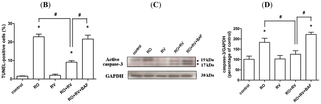 The protective effect of resveratrol against rotenone-induced neurotoxic apoptosis is associated with autophagy. SH-SY5Y cells pretreated with/without 20 μM resveratrol for 24 h were treated with/without 20 μM rotenone in the presence/absence of 10 nM bafilomycin A1 for the next 24 h. (A,B) Apoptotic cell death was detected by TUNEL immunofluorescence staining (green). Nuclei were stained with DAPI (blue). Scale bar, 50 μm. Apoptotic cells were quantitated using Image J (NIH, USA) and data are presented as the percentage of TUNEL-positive cells to DAPI-positive cells; (C,D) Immunoblots for the active (cleaved) form of caspase-3 and glyceraldehyde-3-phosphate dehydrogenase (GAPDH), which are a marker of apoptosis and loading control, respectively. Blots were analyzed using Image J. Data were normalized to GAPDH and expressed as a percentage of control. RO, rotenone; RV, resveratrol; BAF, bafilomycin A1. Data (mean ± SEM) are representative of at least three independent experiments. Statistical significance was determined by one-way analysis of variance followed by Bonferroni post-hoc test. # p < 0.05 compared between groups. * p < 0.05 compared to control.