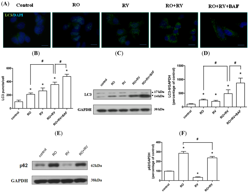 2.2. Resveratrol Increases Rotenone-Induced Autophagosome Formation