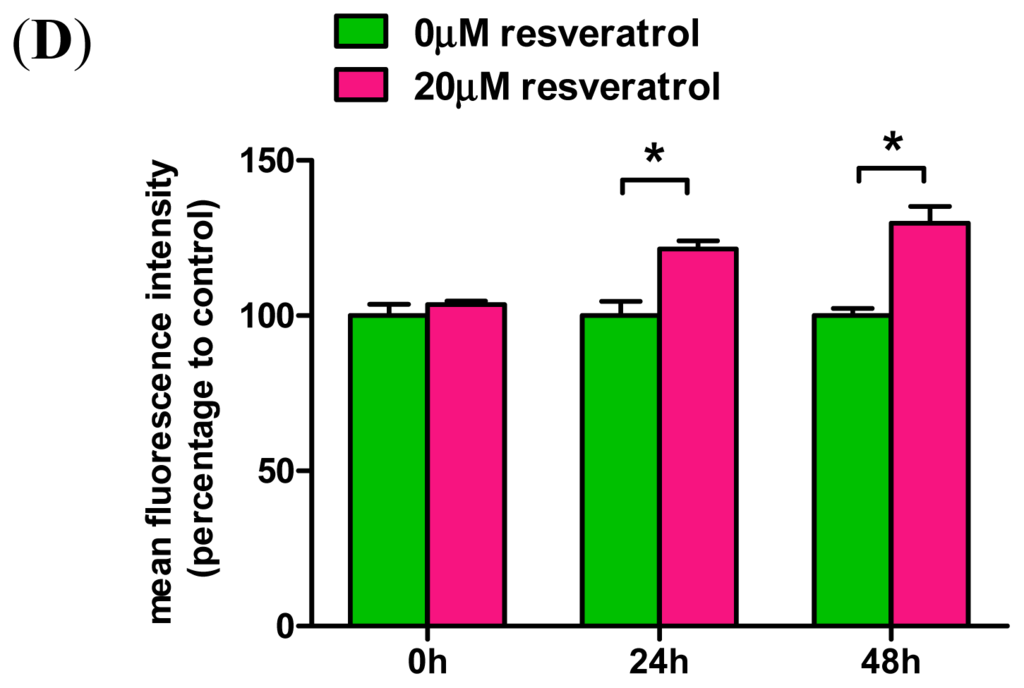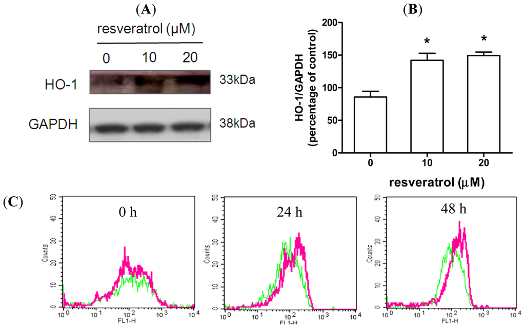 Resveratrol increases HO-1 expression. (A,B) SH-SY5Y cells were treated with 0–20 μM resveratrol for 48 h. HO-1 expression was determined by immunoblotting followed by quantitative analysis using Image J. Data were normalized to glyceraldehyde-3-phosphate dehydrogenase (GADPH) levels. Data (mean ± SEM) are representative of at least three independent experiments. * p <0.05 compared to untreated control; (C,D) Cells were treated with/without 20 μM resveratrol for 0, 24, or 48 h, followed by fixation and permeabilization. HO-1 levels were determined by flow cytometry. Data (mean ± SEM) are representative of at least three independent experiments and are expressed as the percentage of mean fluorescence intensity (MFI) relative to control at each time point. Statistical significance was determined by one-way analysis of variance followed by Bonferroni post-hoc test. * p < 0.05 compared to control.