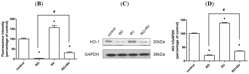 Rotenone-mediated inhibition of HO-1 expression is prevented by resveratrol. SH-SY5Y cells were pretreated with/without 20 μM resveratrol for 24 h then treated with/without 20 μM rotenone for the next 24 h. (A,B) HO-1 expression (red) was determined by fluorescence microscopy and quantified using Image J. Nuclei were observed by DAPI (blue) staining. Scale bar, 50 μm; (C,D) HO-1 expression was determined by immunoblotting followed by quantitative analysis using Image J. Data were normalized to glyceraldehyde-3-phosphate dehydrogenase (GADPH) levels. RO, rotenone; RV, resveratrol. Data (mean ± SEM) are representative of at least three independent experiments. Statistical significance was determined by one-way analysis of variance followed by Bonferroni post-hoc test. # p < 0.05 compared between groups. * p < 0.05 compared to control.