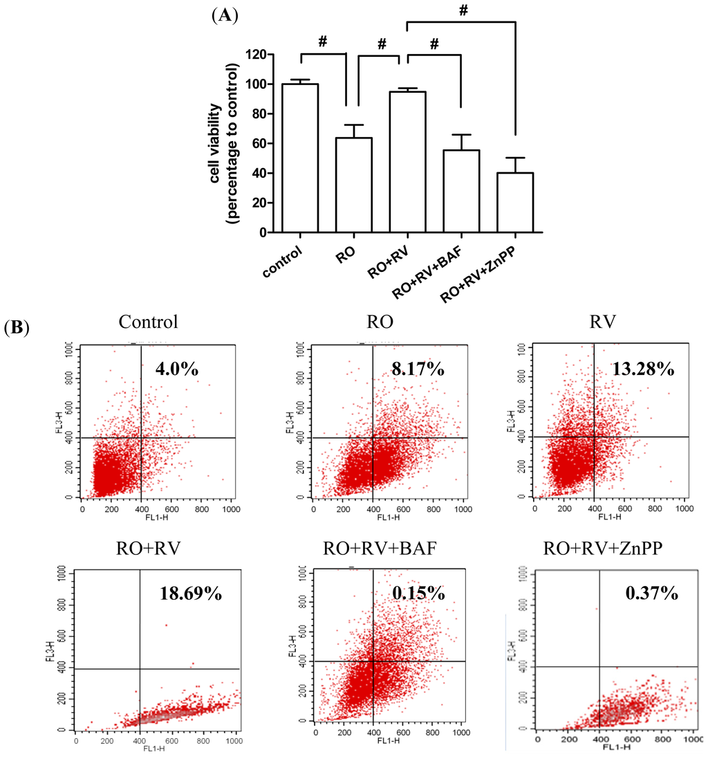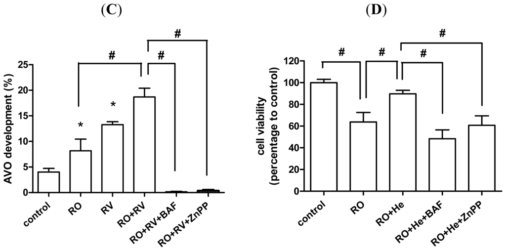 The protective effects of resveratrol are mediated by HO-1-dependent autophagy. (A,B,C) SH-SY5Y cells were pretreated with/without 20 μM resveratrol for 24 h then treated with/without 20 μM rotenone in the presence/absence of 10 nM bafilomycin A1 or 10 μM ZnPP for the next 24 h. (A) Cell viability was determined by WST-8 assay; (B,C) Acidic vesicular organelles (AVOs) stained by acridine orange were analyzed by cytometry. AVO formation was defined as the percentage of cells in the top grid of each panel; (D) SH-SY5Y cells were pretreated with/without 5 μM hemin for 24 h then treated with/without 20 μM rotenone in the presence/absence of 10 nM bafilomycin A1 or 10 μM ZnPP for the next 24 h. Cell viability was determined by WST-8 assay. RO, rotenone; RV, resveratrol; BAF, bafilomycin A1; ZnPP, zinc protoporphyrin-IX; He, hemin. Data (mean ± SEM) are representative of at least three independent experiments. Statistical significance was determined by one-way analysis of variance followed by Bonferroni post-hoc test. # p < 0.05 compared between groups. * p < 0.05 compared to control.