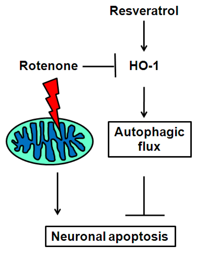 Autophagic flux is a dynamic process that includes initiation, elongation, maturation and degradation. Recently, autophagy dysfunction has been linked to PD development in humans and in mice with a conditional knockout of Atg7 [47]. Herein, we provide evidence that resveratrol induces HO-1 to augment autophagic flux and thus prevent rotenone-induced neuronal apoptosis. This is a novel insight into the cellular mechanisms of resveratrol in preventing neurodegeneration, and provides potential downstream targets for future therapeutic strategies.