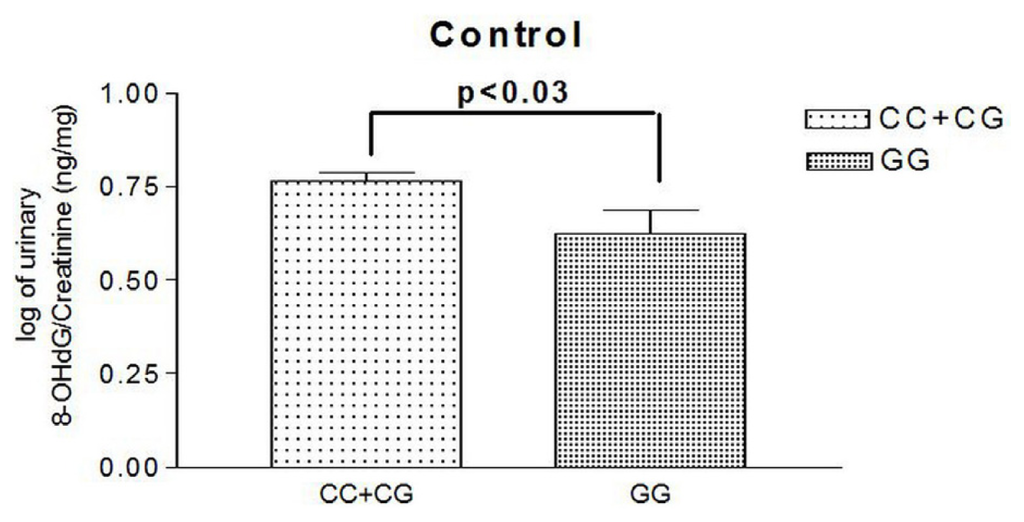 Urine 8-OHdG concentrations in different genetic variants. CC, Ser/Ser; CG, Ser/Cys; GG, Cys/Cys.