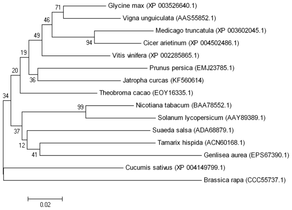 tAPXs have been cloned from many plants, and sequence analysis has revealed a conserved region [16], which was used to design the degenerate primers to clone the tAPX gene from J. curcas. A 327-bp fragment was amplified from the cDNA of J. curcas leaves. The full-length cDNA, named JctAPX (GenBank accession number: KF560416), was obtained by 5′ and 3′-rapid amplification of cDNA end (RACE). The cloned JctAPX gene consisted of 1194 base pairs that encoded a polypeptide of 397 amino acid residues with a calculated molecular mass of 42.84 kDa. Sequence alignment of the deduced amino acid sequence (Figure 1) showed that it was approximately 70% identical to its homologues in Glycine max, Medicago truncatula, Vigna unguiculata, and Theobroma cacao. Highly conserved amino acid sequences appeared in the C-terminal regions, whereas non-conserved sequences existed in the N-terminal regions (Figure 1). In addition, phylogenetic analysis based on a neighbor-joining (NJ) bootstrap method indicated that JcAPX was most closely related to PpAPX from Prunus persica (Figure 2).