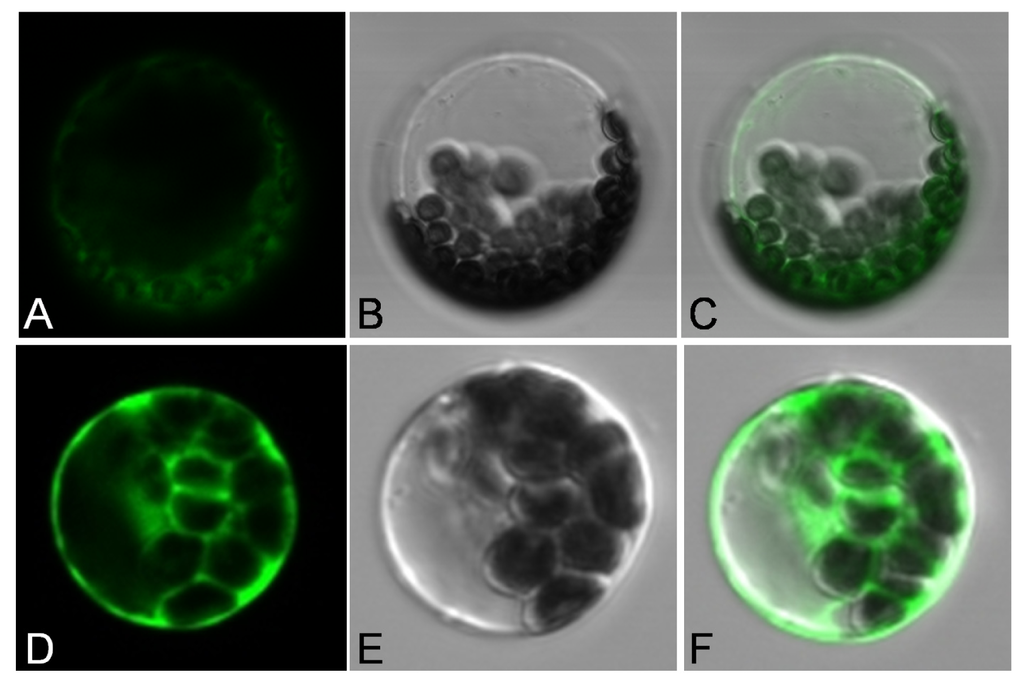 - Yoo, S.D.; Cho, Y.H.; Sheen, J. Arabidopsis mesophyll protoplasts: A versatile cell system for transient gene expression analysis. Nat. Protoc 2007, 2, 1565–1572. [Google Scholar]
