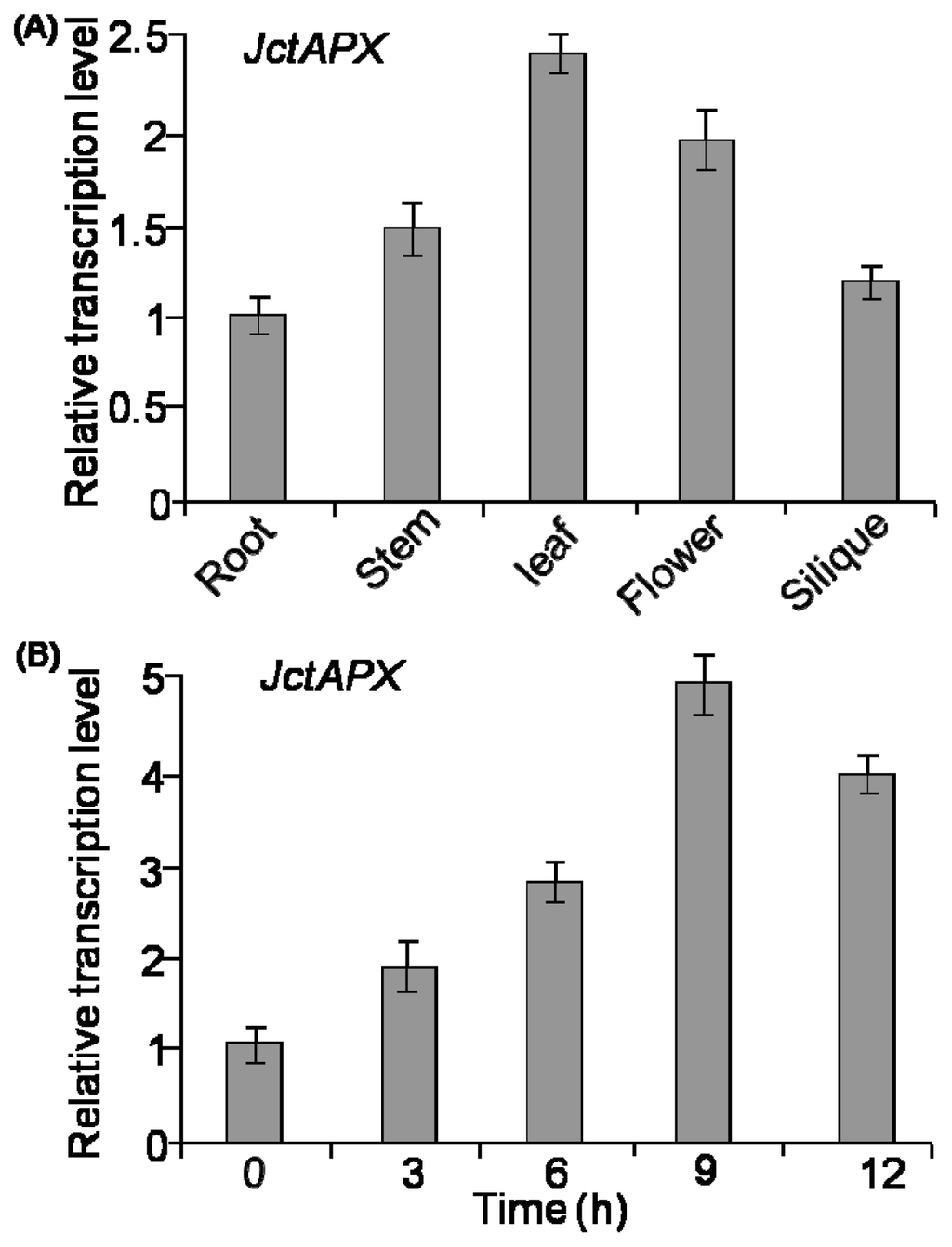 (A) The expression of JctAPX in different J. curcas tissues. The root, stem, leaf, flower, and silique were harvested, and total RNAs were extracted to run qRT-PCR. The amount of root mRNA expression was set as 1 for reference. The data are means of four separate runs and standard deviations (SDs) are indicated; and (B) The level of JctAPX transcripts induced by NaCl stress. Total RNAs were isolated from 4-week-old leaves of J. curcas treated with 400 mM NaCl, and then analyzed by qRT-PCR. The transcripts of actin were used as a control, and the amount of WT mRNA expression at 0 h was set as 1. The data are means of four separate runs and SDs are indicated.