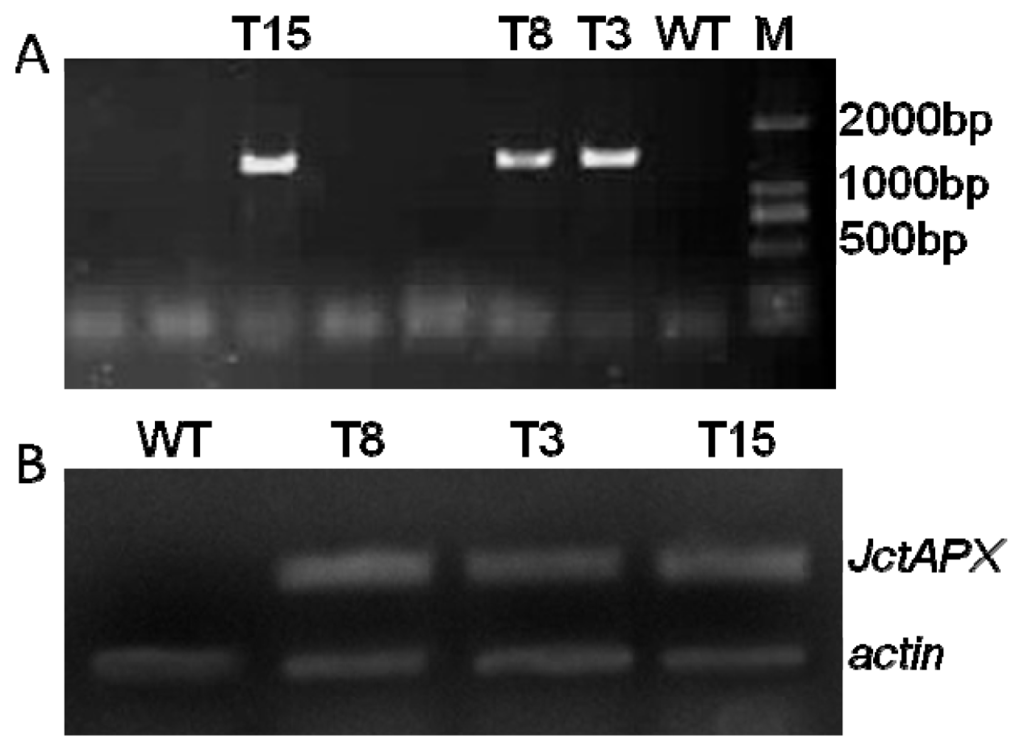 Molecular identification of tobacco plants transformed with JctAPX. (A) PCR identification of tobacco plants transformed with JctAPX. Lane M, DNA marker (DL2000); and (B) Over-expression of JctAPX in transgenic lines was confirmed by semi-quantitative RT-PCR. Actin was used as a reference to show that equal amounts of RNA were used in the analysis. WT, wild type; T3, T8 and T15, independent transgenic tobacco lines.
