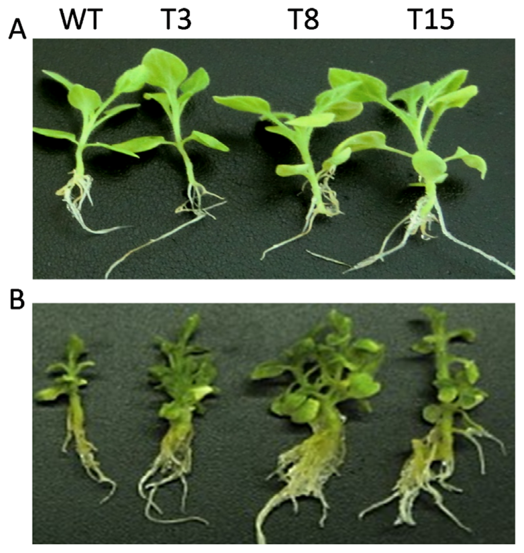 Growth of WT and transgenic tobacco seedlings on MS medium supplemented with 200 mM NaCl and untreated. Seven-day-old seedlings were transferred to MS agar plates supplemented with 200 mM NaCl or un-supplemented, and allowed to grow for four weeks. (A) Normal condition; and (B) 200 mM NaCl treatment. WT, wild type; T3, T8 and T15, independent transgenic tobacco lines.
