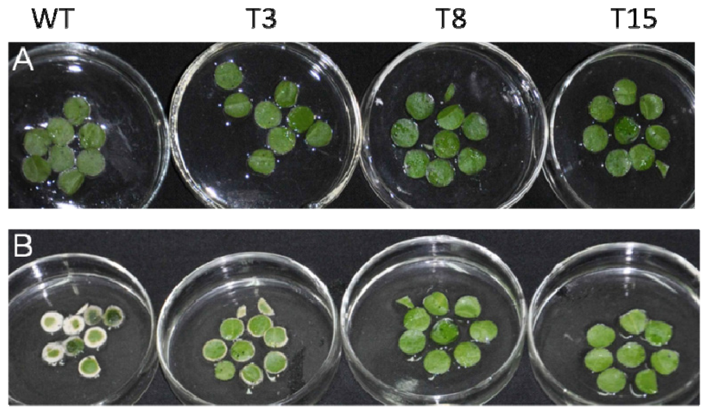 Visible damage to tobacco leaf discs exposed to salt treatment for 4 days. (A) Normal condition; and (B) 400 mM NaCl treated. WT, wild type; T3, T8 and T15, independent transgenic tobacco lines.