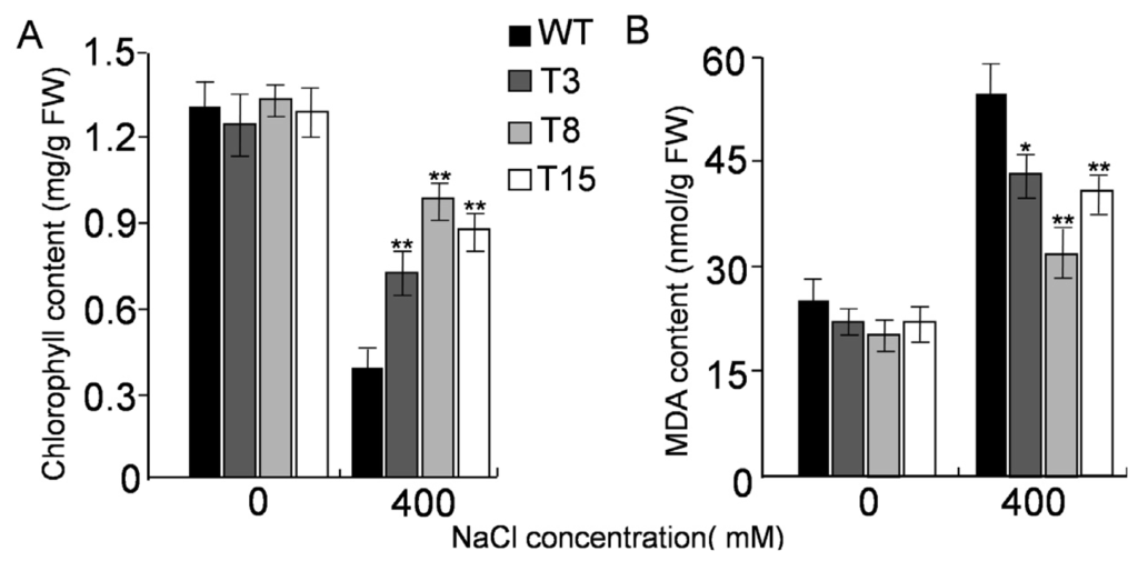 Effects of salt treatment on WT and transgenic tobacco lines. (A) Spectrophotometric quantification of chlorophyll contents of leaf discs treated with different concentrations of NaCl; and (B) MDA content analysis in transgenic tobacco lines and WT under salt stress. WT, wild type; T3, T8, and T15, transgenic lines. Values are expressed as means (n = 3); errors bars show the SD for each experiment. The single (*) and double asterisks (**) represent significant differences as determined by the Student’s t-test at p < 0.05, and p < 0.01, respectively.