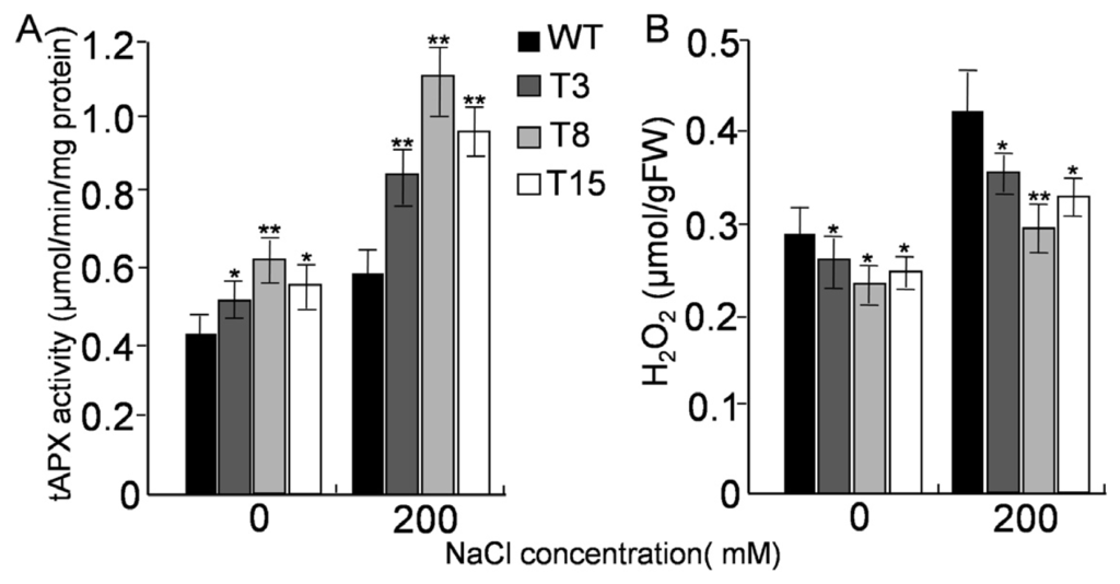 Since the main function of APX is scavenging H2O2, it is necessary to detect endogenous H2O2 in transgenic and WT plants. The H2O2 content of plant leaves was quantified. Under normal growth conditions, H2O2 accumulation was low. After treatment with 200 mM NaCl for 24 h, WT plants accumulated more H2O2 than transgenic plants. Lines T3, T8, and T15 exhibited approximately 15%, 25%, and 21% lower H2O2 concentration, respectively, than WT (Figure 9B).