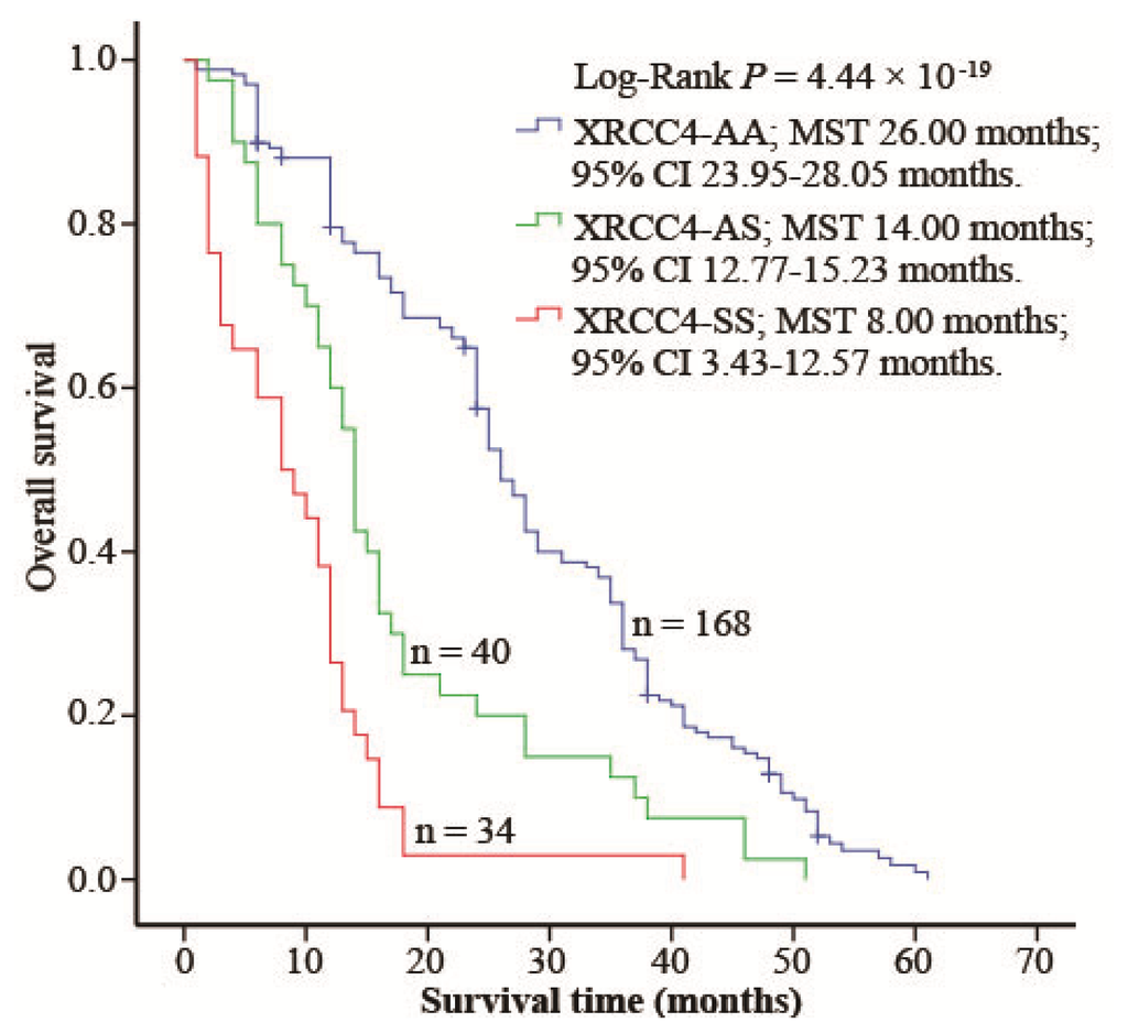 Because a previous study had shown that the variants in the DNA repair genes might modify DIA prognosis [21], we analyzed the survival information of all DIA cases. During the follow-up period of 242 DIA patients, 231 died 77.2% of which showed a one-year overall survival rate (OSR), 25.8% a three-year OSR, and 0.6% a five-year OSR. Kaplan–Meier survival analysis showed that DIA patients carrying XRCC4-AS/SS had a shorter overall survival time [the median survival time (MST) was 14 and 8 months for patients with XRCC4-AS and XRCC4-SS, respectively] compared to those with XRCC4-AA (MST, 26 months) (Figure 1). Multivariate cox regression analysis (with stepwise forward selection based on likelihood ratio test) was next performed to determine whether XRCC4 codon 247 polymorphism was an independent predictor of overall survival for patients with DIA. The results exhibited that this polymorphism increased the risk of dying of DIA, with a hazard ratio (HR) of 2.26 for XRCC4-AS and 5.36 for XRCC4-SS (p < 0.01; Table 5), respectively.