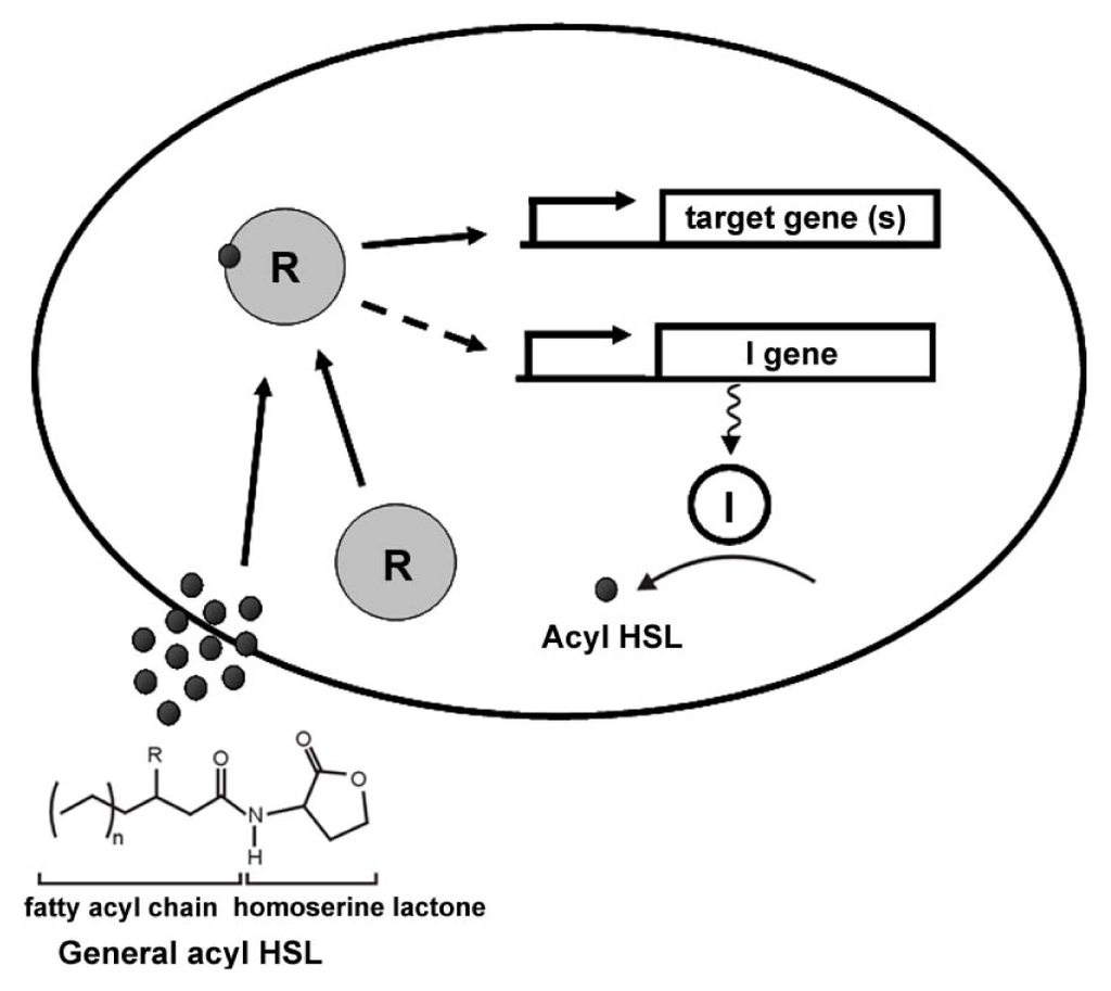 Basic model of quorum sensing (QS) circuits. The eclipse represents a cell. The I gene represents the luxI homologue. R represents the acylated homoserine lactone (AHL) receptor LuxR protein. The dark unfilled circle represents the LuxI enzyme while the dark solid dots represent the AHL molecules. Stalked arrows indicate the transcription of the genes and the dotted line with arrow shows the positive feedback by the complex of the LuxR receptor and AHLs on the AHL synthase gene. The solid line with arrow depicts the function of R complex on the target genes. Squiggly line indicates translation of I gene and solid curved line with arrow indicates enzymatic function of I gene. The left corner shows the basic structure of a typical AHL molecule. N can vary from 4 to 18. R can be oxo, OH or H.