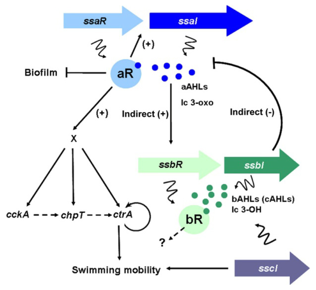 We have been examining Ruegeria sp. KLH11 (hereafter referred as KLH11) as a representative to study QS pathways in marine roseobacters. Arguably, KLH11 represents one of the best-studied roseobacterial species for its AHL-mediated QS circuits. Our studies have shown that KLH11 has very complex and interconnected QS networks (Figure 2). KLH11 has two LuxI–LuxR pathways and one LuxI solo, designated ssaIR, ssbIR and sscI, respectively. SsaIR are orthologous to SilI1R1 in Ruegeria pomeroyi DSS-3 while SsbIR are orthologues of SilI2R2 [,].