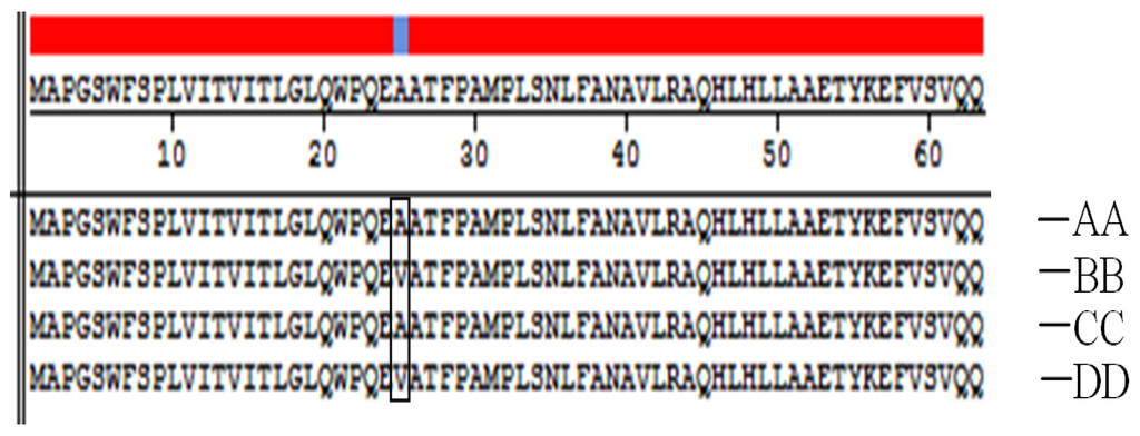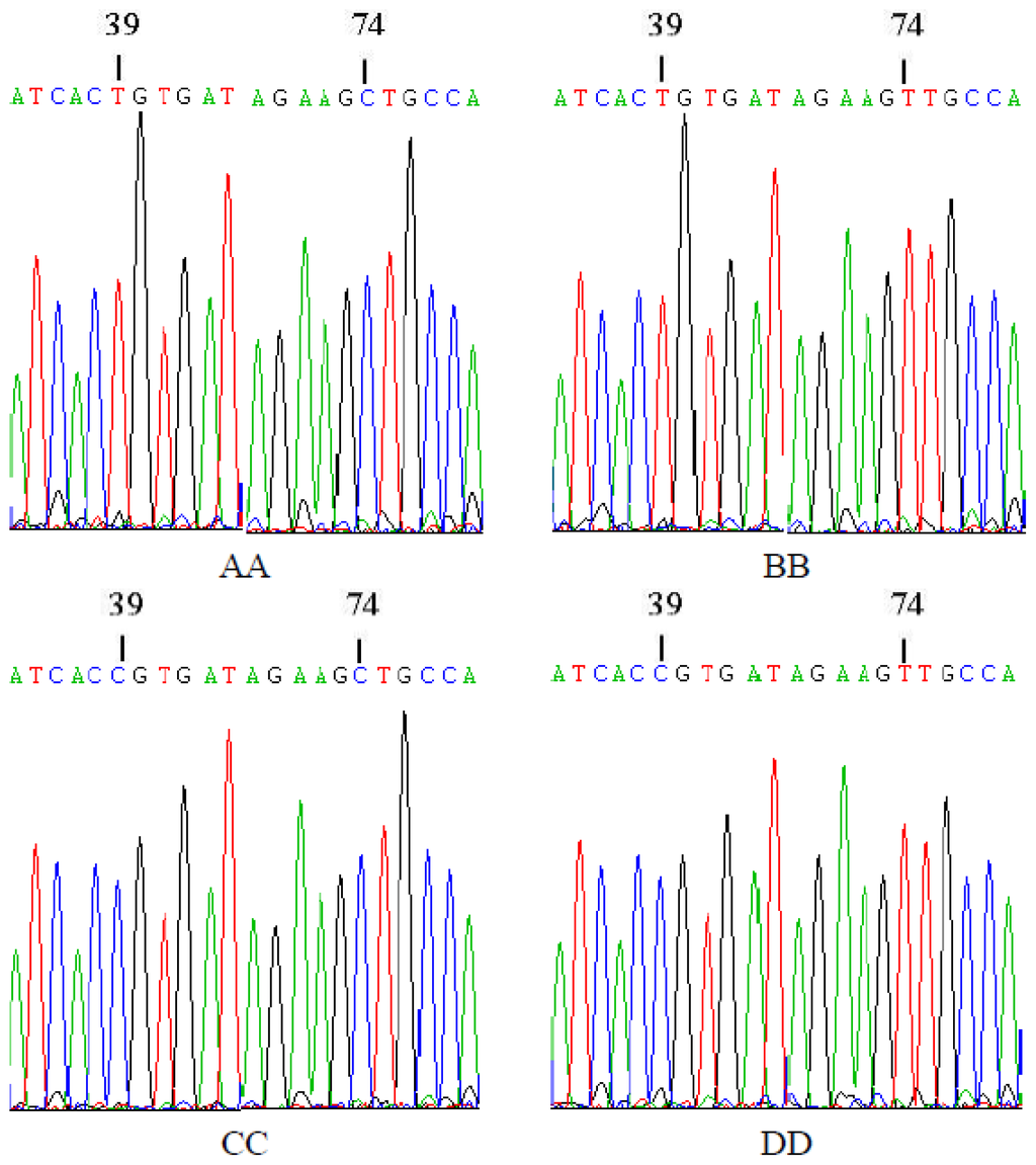 2.4. Genotypes and Variations in the Allelic Frequencies of Exon 2 of the GH Gene