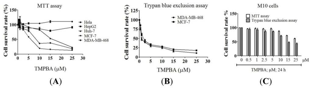 2.1. Differential Susceptibility of Cancer Cell Lines to TMPBA-Induced Cell Death