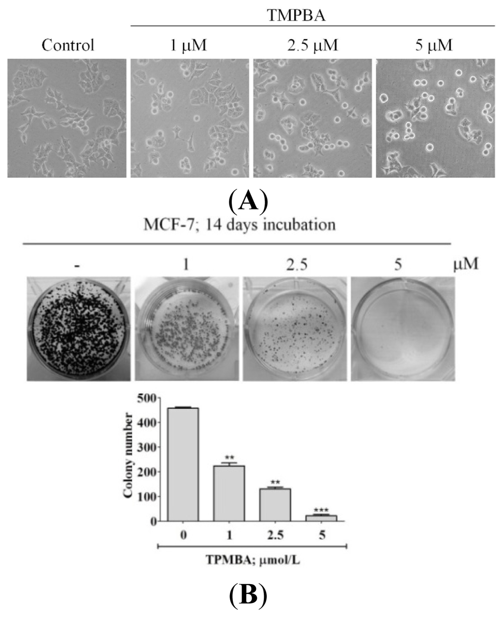 2.2. TMPBA Changed Cell Morphology and Decreased Colony Formation in Breast Cancer Cells