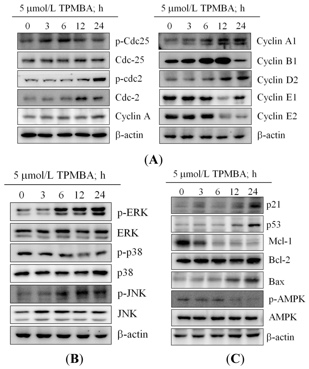2.4. Modulation of the Expression of Cyclin B, Cyclin E, cdc2, and cdc25 in TMPBA-Treated Cells