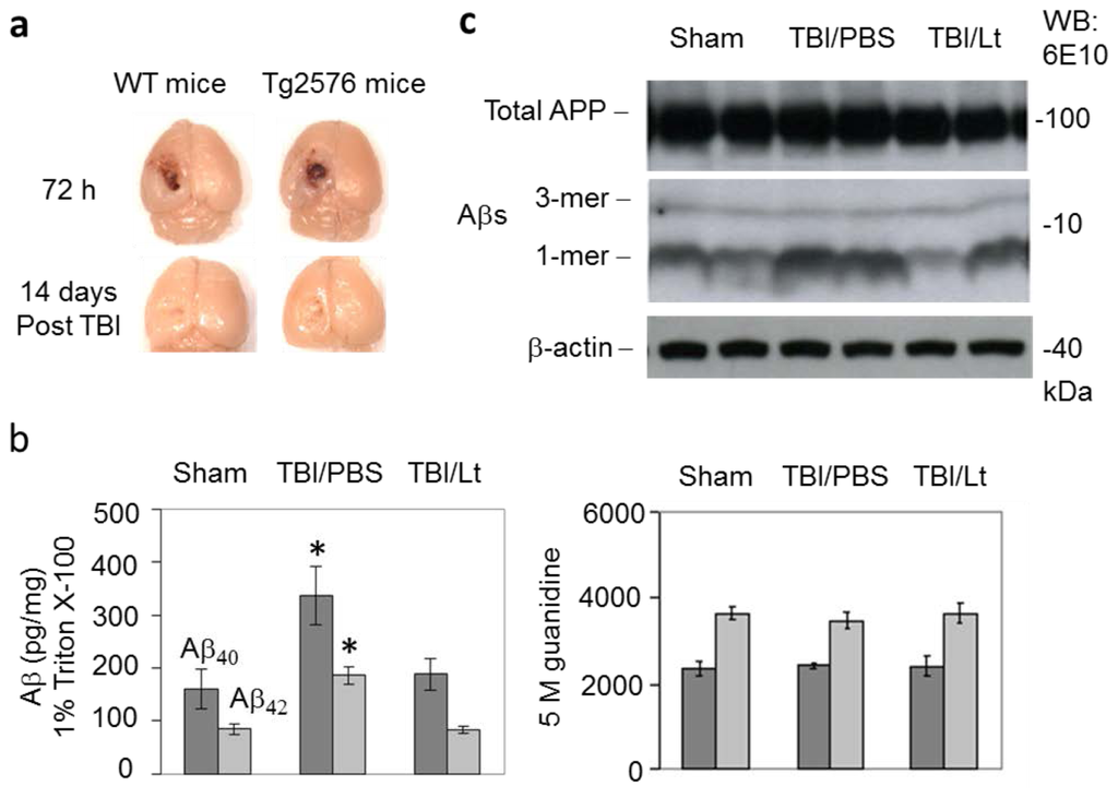 Luteolin significantly reduces amyloid pathology elicited by traumatic brain injury (TBI) in Tg2576 mice. TBI was elicited in Tg2576 mice and wild-type (WT) littermates using a controlled cortical impactor. A single impact trauma was delivered with a 1.0 mm impact probe, an impact depth of 1.0 mm, velocity of 6 m/s and dwell time of 100 ms. Following 72 h and 14 days post injury, the mice were sacrificed and the damaged area was determined by thionin coloration. The area of brain damage at 72 h and 14 days following TBI were similar between Tg2576 and WT controls (a); For determination of amyloid pathology, Tg2576 mice (n = 12, 6 F/6 M) were treated with luteolin (Lt) at 20 mg/kg or PBS ip daily for 15 days followed by TBI. Three days after TBI, the mice were sacrificed and brain homogenates were prepared and subjected to (b) ELISA for cerebral Aβ levels and (c) western blot (WB) for analysis of total APP and Aβ monomers and trimers using an anti-Aβ1–17 antibody (6E10). As shown, TBI significantly increased soluble Aβ40,42 levels, extracted with 1% triton X-100 (asterisks indicate p < 0.01), and this increase was solely due to an increase in Aβ monomers. In addition, luteolin abolished this increase in soluble Aβ levels. TBI did not increase insoluble Aβ40,42 levels, extracted with 5 M guanidine.