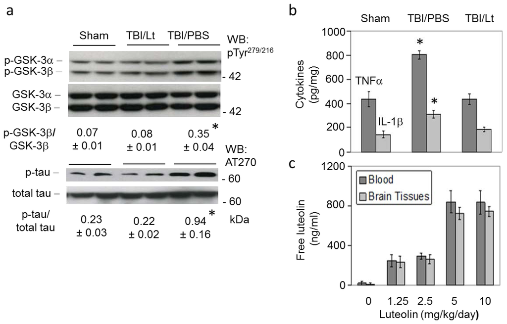 Luteolin significantly reduces GSK activation, tau phosphorylation and microglial-induced release of inflammatory cytokines elicited by TBI in Tg2576 mice. (a) Brain homogenates were subjected to western blot (WB) for GSK activation and tau phosphorylation using antibodies against phospho- and total GSK-3α/β (pTyr279/216) and phospho- and total tau (AT270), respectively. Densitometry analysis reveals the ratio of active phosphorylated GSK-3β to total GSK-3β and AD-like phospho-tau to total tau, as indicated below the figures; In addition, brain homogenates were subjected to (b) ELISA for various cytokines, including microglial-derived TNFα and IL-1β. TBI significantly increased activated phospho- to total GSK-3β ratio, phospho- to total tau ratio and TNF-α and IL-1β levels (Asterisk indicates p < 0.01) and these increases were significantly abolished with luteolin; (c) Additional studies determined the ability of peripherally administered luteolin to cross the blood brain barrier (BBB). Total luteolin levels in blood and brain tissues reached approximately 800 ng/mL after treatment with luteolin at 5 and 10 mg/kg/day by gavage for 4 weeks. Altogether, these results indicate that peripheral administration of luteolin freely penetrates the BBB and enters the brain, underscoring the potential effectiveness of luteolin for treatment of TBI-induced AD pathology.