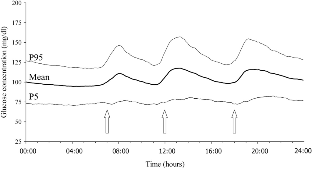 Daily glucose profile in healthy subjects assessed by continuous glucose monitoring. The central line is the mean, and the two outer lines represent the 5th and 95th percentiles (P5 and P95, respectively). Arrows indicate the times of three meals during a day. Reproduced with permission from the American Diabetes Association [].