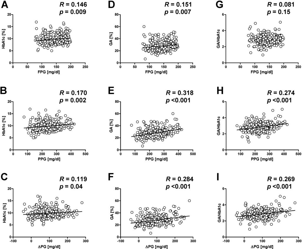 Correlations among HbA1c, glycated albumin (GA), GA/HbA1c ratio and other glycemic indices. HbA1c and GA were both significantly correlated with fasting plasma glucose (FPG) (A,D), postprandial plasma glucose (PPG) (B,E) and ∆PG (i.e., PPG-FPG) (C,F), while GA was more strongly correlated with PPG and ∆PG than was HbA1c. There was a significant positive correlation between PPG (H) and ∆PG (I) and GA/HbA1c ratio, but no correlation between FPG and GA/HbA1c ratio (G). Reproduced with permission from the Japan Diabetes Society [].
