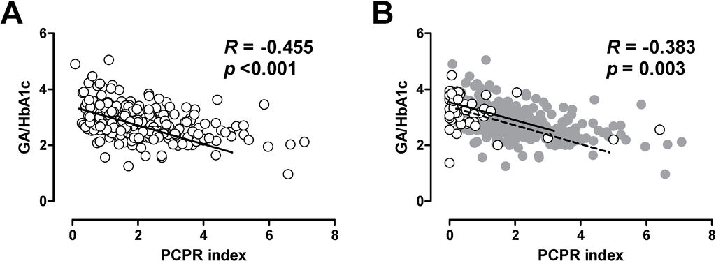 Correlation between postprandial C-peptide index (PCPRI) and glycated albumin (GA) to HbA1c ratio in patients with type 2 diabetes (A) and type 1 diabetes (B). (B) The data of patients with type 1 diabetes are superimposed on the data of those with type 2 diabetes (gray circles and dotted line). Reproduced with permission from the Japan Diabetes Society [].