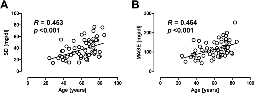 Age is another factor associated with GV. Munshi et al. reported that the proportion of postprandial hyperglycemia in total hyperglycemia was greater in older (≥65 years) patients with T2DM compared with younger (<65 years) patients []. We have also reported that SD and MAGE assessed by CGM were significantly associated with age in patients with T2DM (Figure 4). The progressive decline in beta cell function with duration of diabetes, impairment of multiple organs such as liver and kidney, reduction in lean mass, and autonomic neuropathy may be attributable to the relationship between age and GV. In addition, polypharmacy and cognitive impairment/dementia, resulting in poor compliance with medication, may also contribute to greater GV in the elderly. A significant inverse association between MAGE and cognitive function has been reported in older patients with T2DM []. Therefore, the increased risk of hypoglycemia in older patients with T2DM [,] is at least in part due to greater GV in this population.