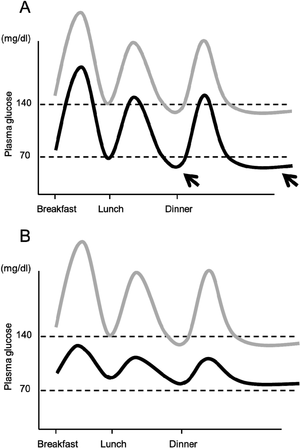 In the Diabetes Control and Complications Trial/Epidemiology of Diabetes Interventions and Complications (DCCT/EDIC) and the UK Prospective Diabetes Study (UKPDS), intensive glycemic control has been shown to reduce the development of CVD as well as diabetic microangiopathy during long-term follow up in patients with both type 1 (T1DM) and type 2 diabetes (T2DM), so-called legacy effects [,]. On the other hand, recent clinical trials aiming at reducing HbA1c to a near-normal level in patients with T2DM have failed to show an additional benefit on CVD outcomes [,,]. In the Action to Control Cardiovascular Risk in Diabetes (ACCORD) trial, the trial was stopped because of a significant increase in all-cause mortality in patients with T2DM who were randomized to the intensive glycemic control group [].