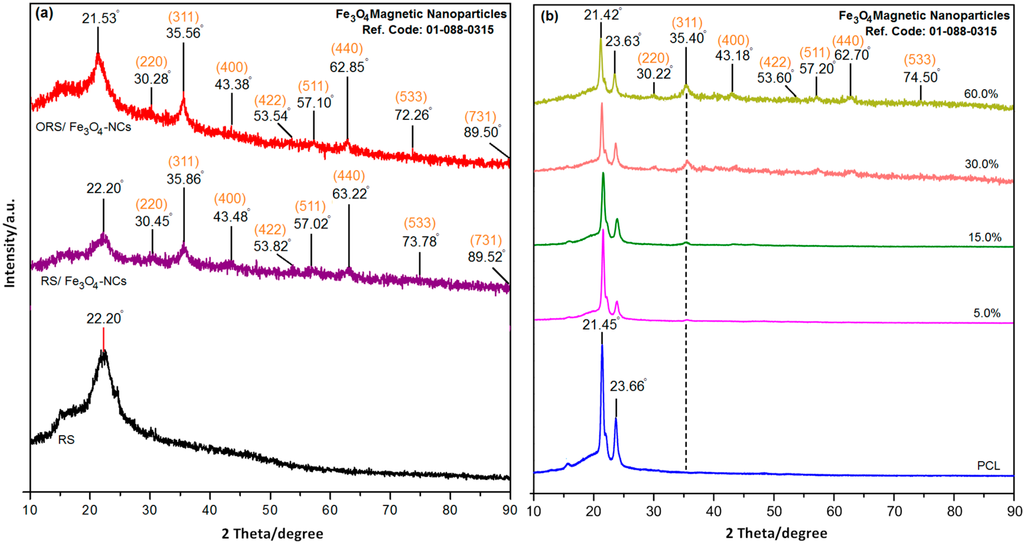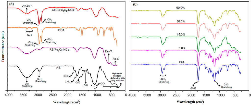 3.4. Preparation of Modified RICE Straw/Fe3O4/Polycaprolactone Nanocomposites
