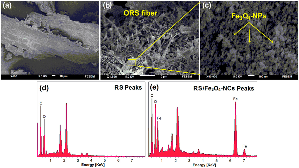 3.3. Modification of Rice Straw/Fe3O4-NCs